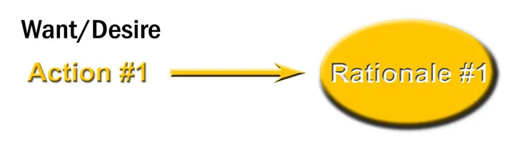 Since the business world often demands we have a rational orientation, we faulty believe that people make decisions about their actions as shown in the left-hand figure below. If they find Rationale #1 as having the best set of reasons, evidence and logic, then people will select the recommended action associated with it, Action #1. If Rationale #3 is the best, then they select Action #3.